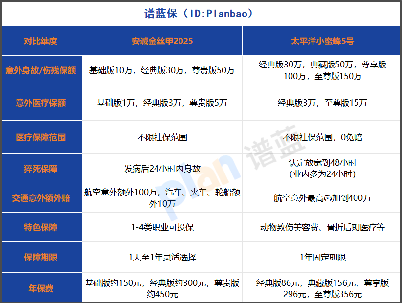 从表格可以看出,两款产品定位不同:金丝甲2025胜在灵活性和职业覆盖广,而小蜜蜂5号在猝死保障和全年保障全面性上更优。
